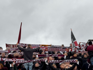 Der mit rund 200 Personen gefüllte Gästeblock konnte einen vergleichsweise guten Support hinlegen, welcher auch vom Tifo überzeugte.